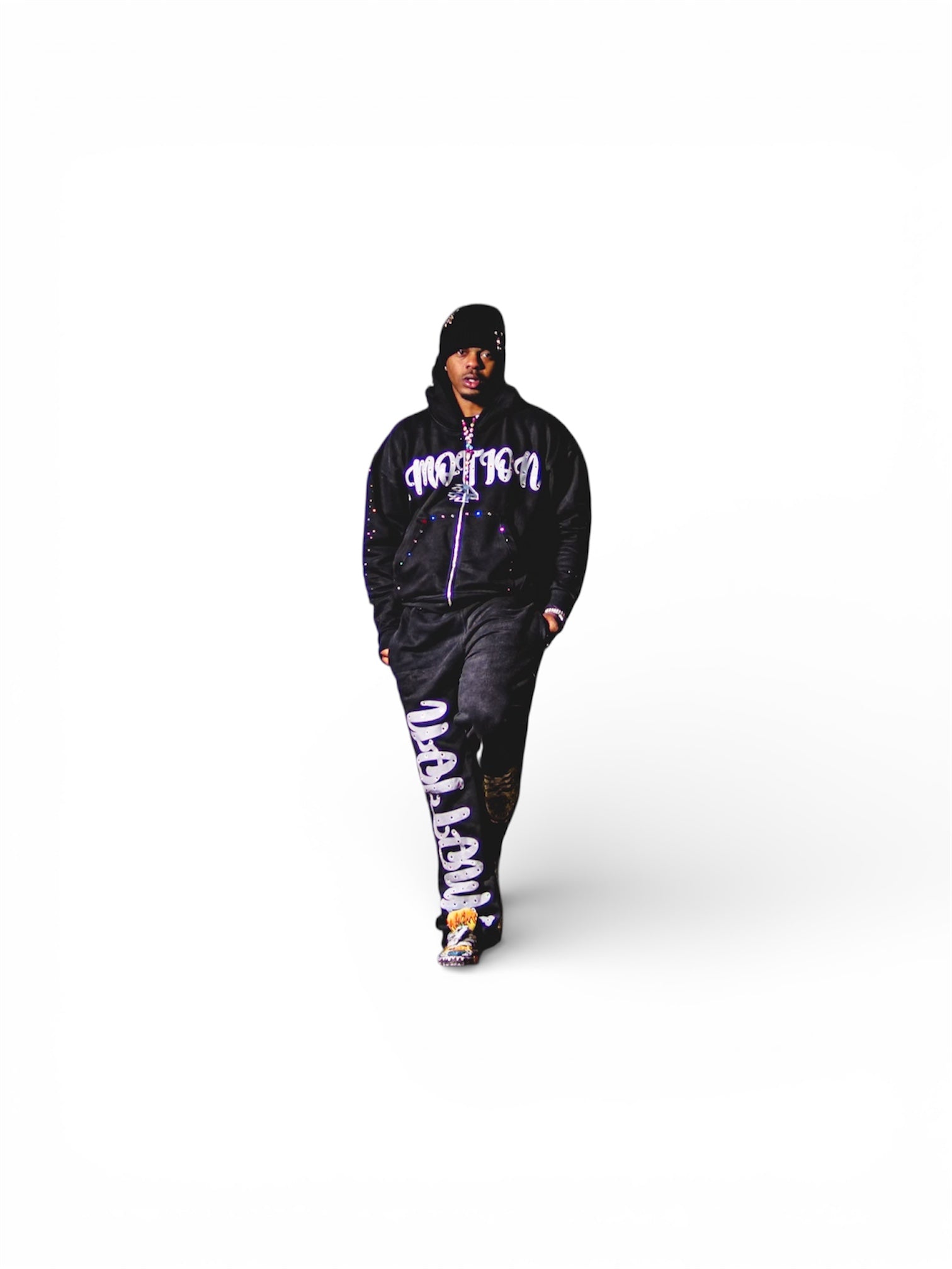 Vibrant rhinestones are screen printed on the initial drop of the 2026 Valentine's Day weekend sweatsuit, available in sizes small through XL and accurately reflecting true dimensions.