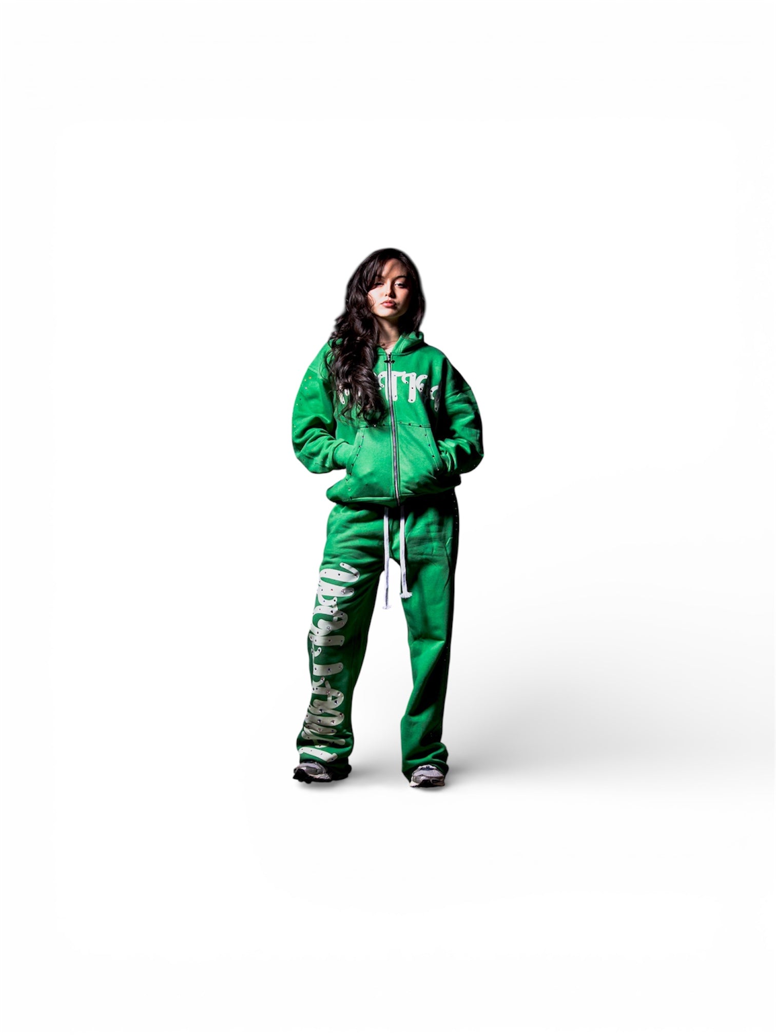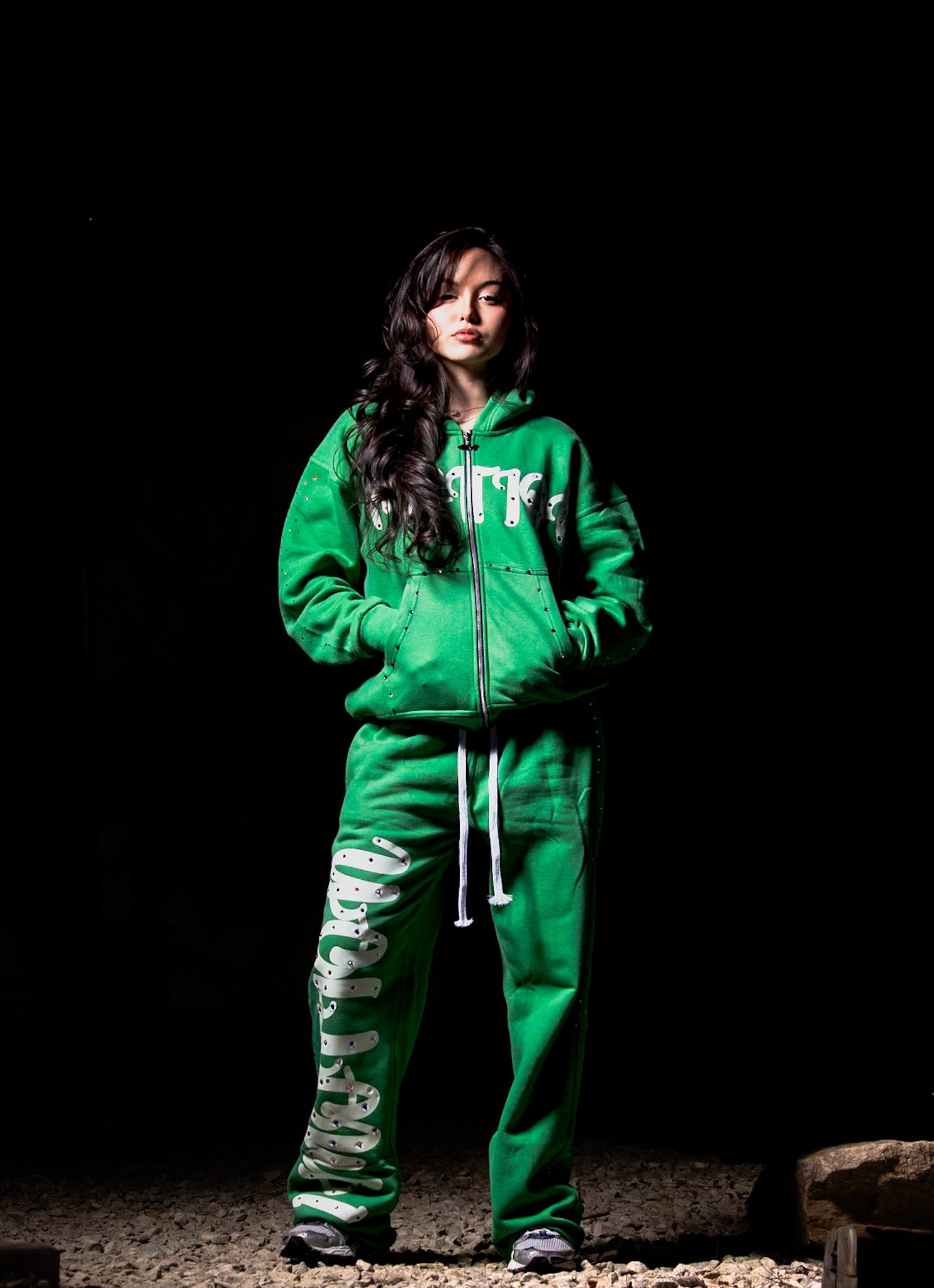 Vibrant rhinestones are screen printed on the initial drop of the 2026 Valentine's Day weekend sweatsuit, available in sizes small through XL and accurately reflecting true dimensions.